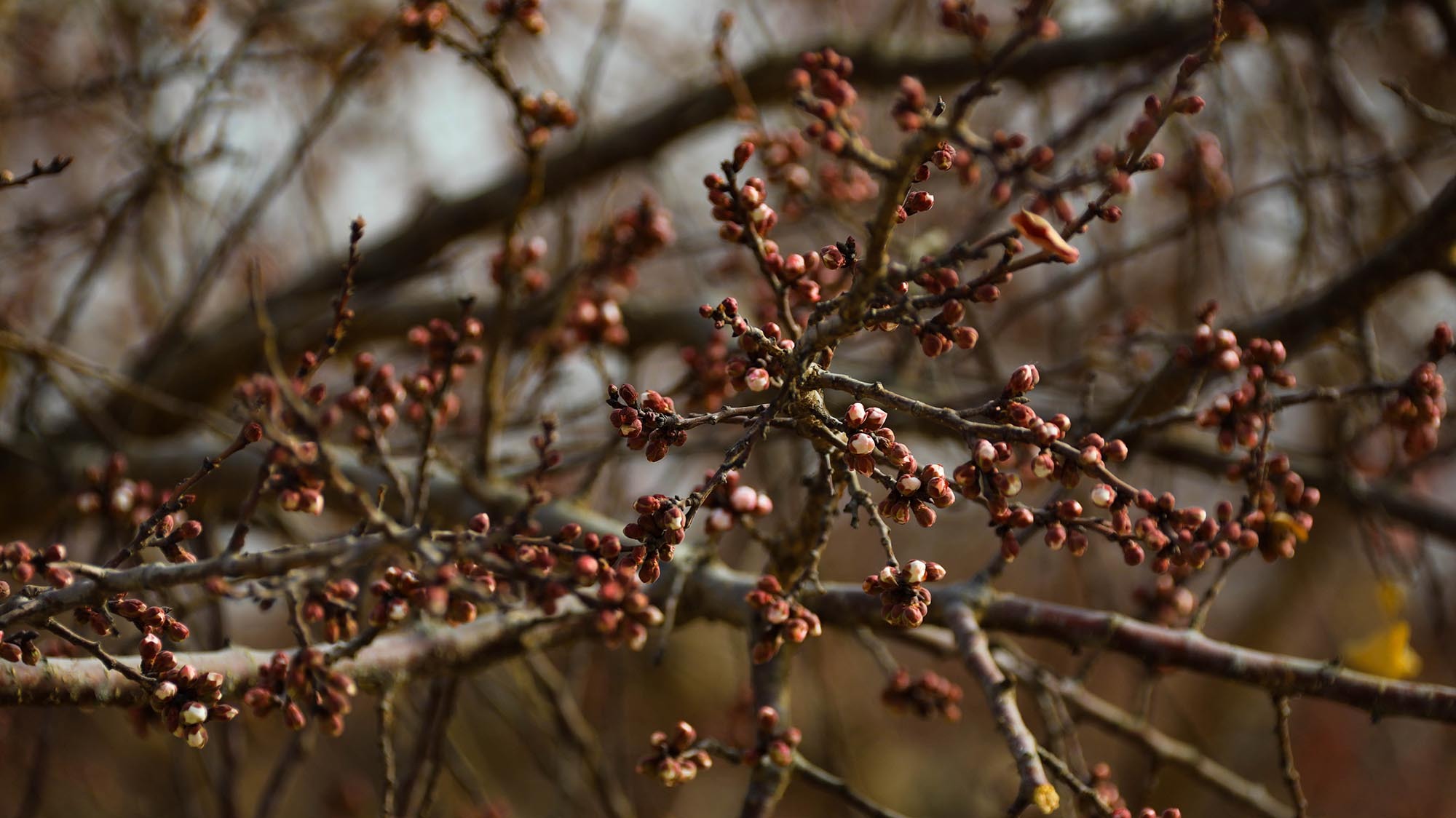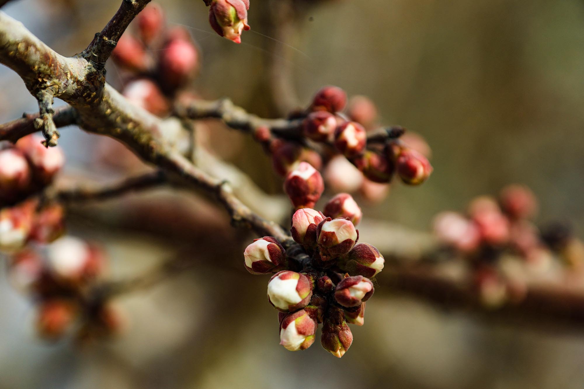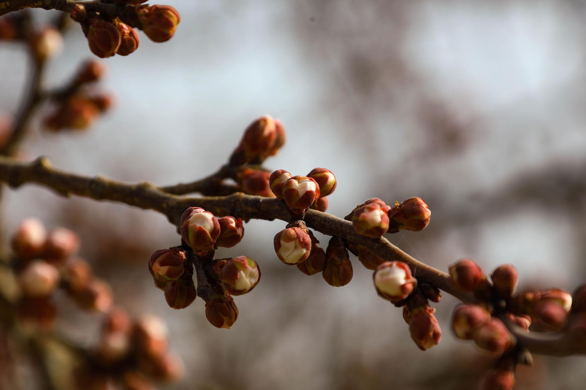 走进南湖村杏园,春日的暖阳温柔地洒在虬曲的杏树枝条上。细心观察会发现,原本褐色的枝梢间,如今已密密麻麻地缀满了饱满的花蕾。这些花蕾个头圆鼓,有的被深红色的萼片紧紧包裹;有的顶端已然裂开细细的缝隙,透出即将绽放的粉白色花瓣边缘,仿佛随时都会挣脱束缚。微风拂过,枝条轻轻摇曳,花蕾静待绽放,传递着春天将至的信号。
